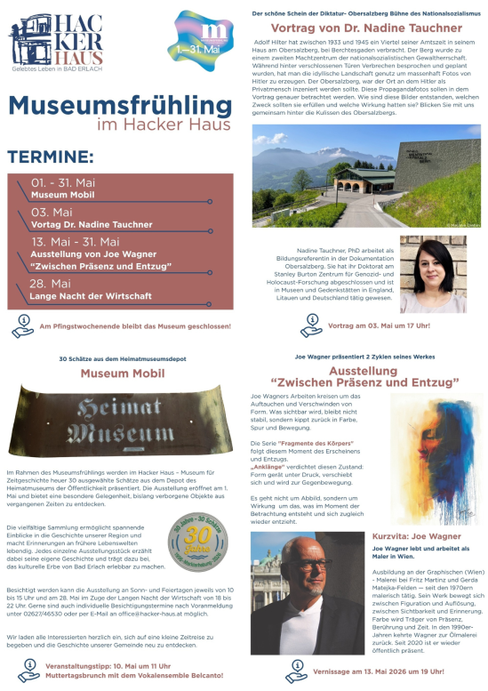 Das Kulturzentrum Hacker Haus in der Marktgemeinde Bad Erlach ist ein besonderes Beispiel für gelebte Zeitgeschichte. Aus einem Forschungsprojekt entstanden, mit viel Engagement und Leidenschaft umgesetzt, gibt das Museum für Zeitgeschichte im Hacker Haus nicht nur beeindruckende Einblicke in Themen der regionalen Geschichte, sondern regt auch zum Nachdenken und Nachfühlen, sowie dem Begreifen von Zusammenhängen an, um Entwicklungen der Gegenwart durch das Erinnern an die Vergangenheit verständlich zu machen. Mit der Dauerausstellung zum jüdischen Leben in der Region Bucklige Welt-Wechselland leistet das Haus einen wichtigen Beitrag zur Aufarbeitung der jüngsten Vergangenheit und ist auch ein besonderer Ort des Erinnerns im Gedenken an die Opfer der Shoah.